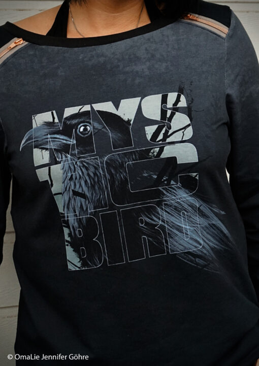 Der Mystic Bird steht mit seinem detailliert illustrierten Gefieder im Kontrast zu dem linearen Schriftzug.