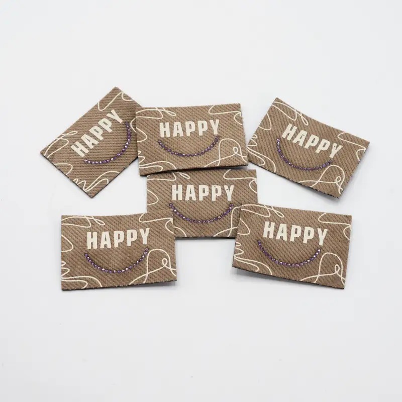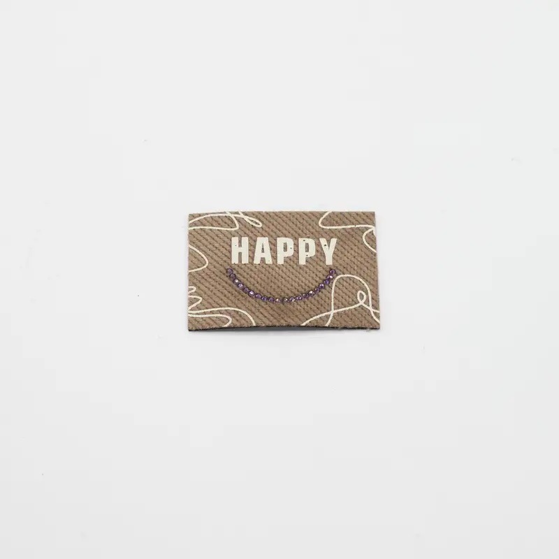 Happy Label Iron on, perfekt zum Individualisieren von Kleidungsstücken mit Glitzersteinen.