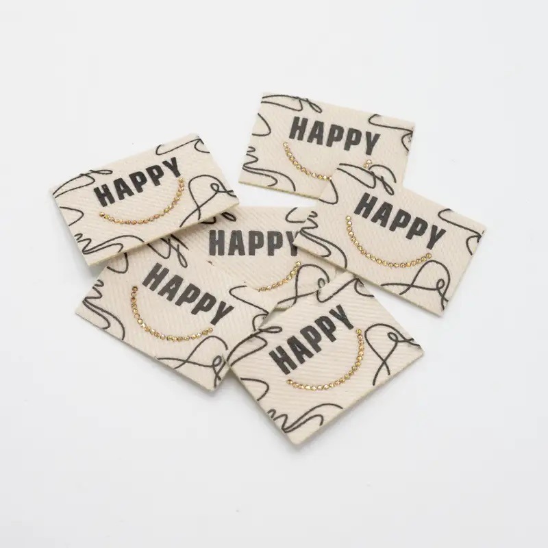 Happy Label Iron on, perfekt zum Individualisieren von Kleidungsstücken mit Glitzersteinen.