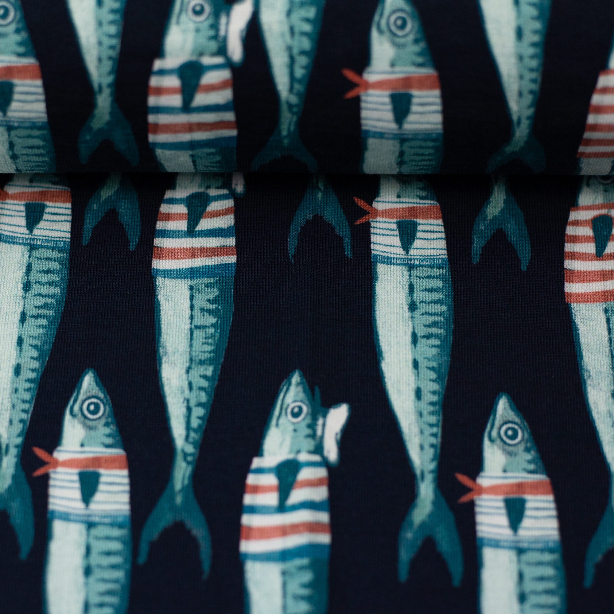 Nelli Simböck widmet ihren neusten Jersey Bienvenido Colorido Los Marineros Fische Bei einem Ausflug ans Meer wurde die in Spanien ansässige Designerin zu den maritimen Jerseys inspiriert. Ein sonniger Tag am Meer, an dem man die Fischerboote und Möwen beobachtet – könnt ihr auch die frische Meeresbrise riechen? Die kleinen Fische bilden einen riesigen Schwarm – die witzigen Pullover, Halstücher und Mützen der Sardinen lockern das Design auf, sorgen für ein Lächeln und lassen sich toll mit Ringeljersey Bella kombinieren. Das Fischdesign gibt es in klassischem Marineblau und einem tollen Hellgelb/Ecru.