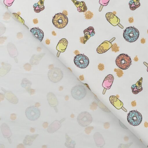 Der Jersey Leckereien Bunt Glitzer ist sehr geeignet für Kinderkleidung jeglicher art.