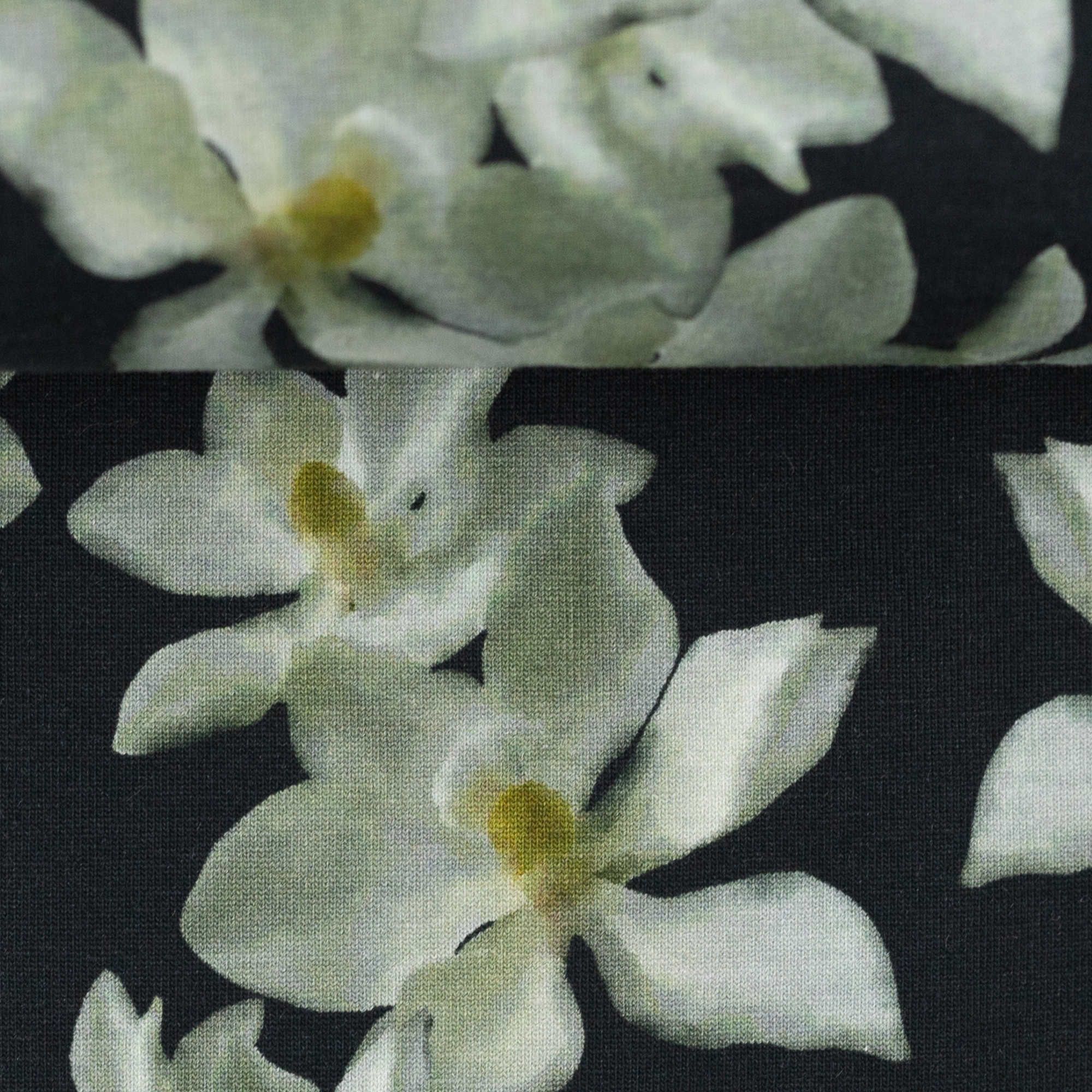 Auf Jersey Elise blühen Magnolien in drei Farben: Weiß, Koralle und Erika! Auf dem schwarzen Hintergrund kommen die zarten Blüten toll zur Geltung. Die schlichten Blütenmotive entfalten vernäht eine wunderbare Wirkung!
