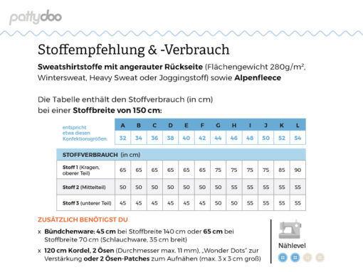 Die Schnittmusterbögen enthalten die Schnittteile der Größen 32 bis 54, dazu gibt es ein Booklet mit Maßtabellen, Zuschnittplänen und Tipps zum Anpassen der Größen.