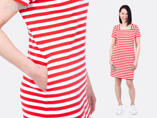 Mit dem Papierschnittmuster „Jill“ verwandelst du Jerseystoffe ruck-zuck in schicke Shirts und sportliche Kleider mit eckigem Karree-Ausschnitt. Dabei entsteht bei gestreiften Stoffen ein schöner Muster-Effekt. Wenn du einen unifarbenen Stoff vernähst, dann kannst du den Ausschnitt mit Webbändern oder Spitze aufpeppen. Bebilderte Anleitungen dazu sind im Booklet enthalten. Wahlweise kannst du dein Shirt/Kleid mit kurzen oder dreiviertellangen Ärmeln nähen und dem Kleid noch praktische Nahttaschen verpassen.