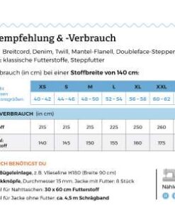 Die Tabelle enthält den Stoffverbrauch (in cm) bei einer Stoffbreite von 140 cm