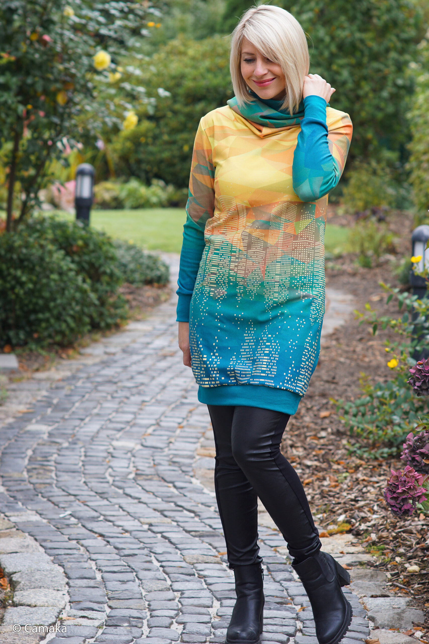 Durch diese beidseitige Bordüre gibt es vielfältige Möglichkeiten, je nachdem, ob man beispielsweise ein Shirt eher aus der Skyline oder dem Himmel zuschneidet oder gar das Schnittteil so auflegt, dass die rechte Seite eine andere Farbe hat als die linke!