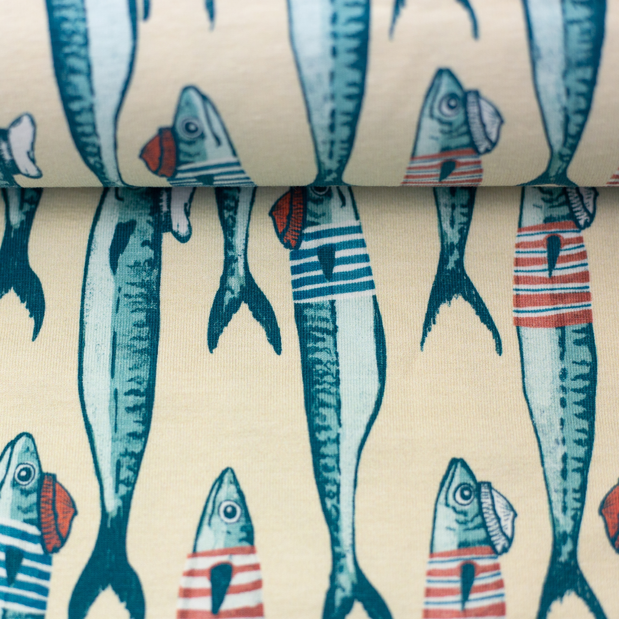 Nelli Simböck widmet ihren neusten Jersey Bienvenido Colorido Los Marineros Fische den Seeleuten. Bei einem Ausflug ans Meer wurde die in Spanien ansässige Designerin zu den maritimen Jerseys inspiriert. Ein sonniger Tag am Meer, an dem man die Fischerboote und Möwen beobachtet – könnt ihr auch die frische Meeresbrise riechen? Die kleinen Fische bilden einen riesigen Schwarm – die witzigen Pullover, Halstücher und Mützen der Sardinen lockern das Design auf, sorgen für ein Lächeln und lassen sich toll mit Ringeljersey Bella kombinieren. Das Fischdesign gibt es in klassischem Marineblau und einem tollen Hellgelb/Ecru.